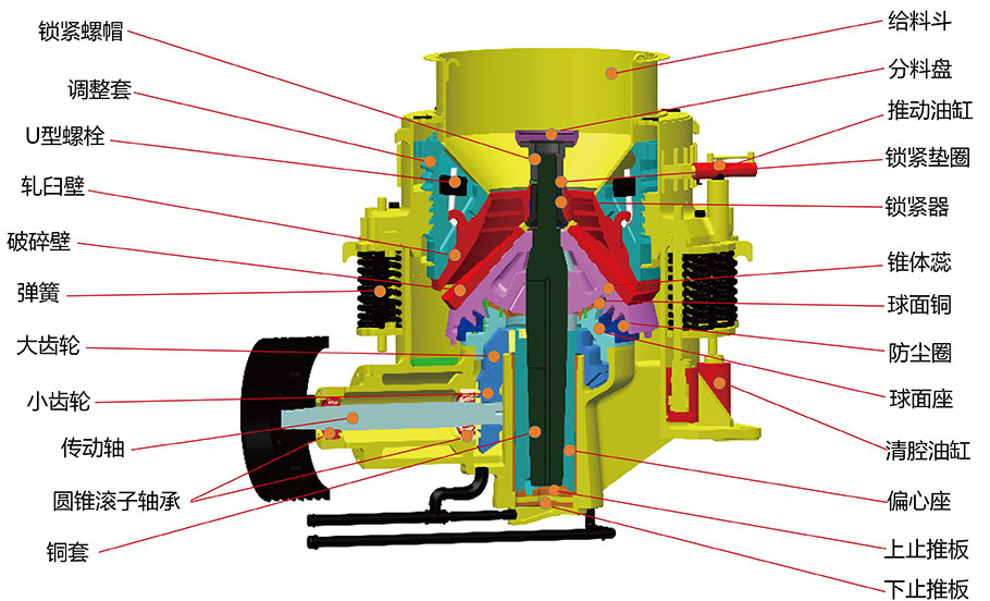 CS系列復合圓錐破碎機主要由機架、定錐總成、動錐總成、彈簧機構、碗型軸架部和傳動等部分組成;其輔助部分由電器系統、稀油潤滑系統和液壓清腔系統組成。工作時,由電動機通過傳動裝置三角帶、大帶輪、傳動軸、小錐齒輪、大錐齒輪帶動偏心套旋轉,破碎圓錐軸心線在偏心軸套的迫動下做旋轉擺動,使得破碎壁表面時而靠近又時而離開軋臼壁的表面,從而使物料在定錐與動錐組成的環形破碎腔內不斷地受到沖擊、擠壓和彎曲而破碎。經過多次擠壓、沖擊和彎曲后,物料破碎至要求粒度經下部排出。