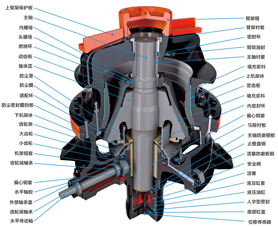 HST系列液壓單缸圓錐破碎機主要由上架體、中架體(中碎型)、下架體、動錐部、偏心套部、傳動部、液壓缸部等部件組成。工作時,電機帶動破碎機的小齒輪,小齒輪帶動大齒輪,大齒輪組件(大齒輪、大齒輪架、偏心鋼套)帶動偏心套組件(偏心缸套、偏心銅套)和主軸組件(主軸、內錐、內錐襯板)以理論垂直線為中心,在銅襯套內公轉,主軸組件在偏心銅套內以主軸的中心線可以實現自轉。空機運行的時候,偏心套組件“抱著”主軸組件和隨大齒輪一同公轉,當物料加入到破碎腔后,主軸總成(主軸、內錐)在物料的阻力下在偏心銅套內緩慢的自轉。內錐的運行軌跡看起來是在破碎腔內來回擺動,同時緩慢的旋轉。物料被擺動的內錐擠壓破碎。支撐套與架體連接處靠液壓缸壓緊,當破碎機內落入金屬塊等不可破碎物體時,單缸的動錐由底部液壓活塞托起,起到排放口調整和過鐵保護、反復起落排除堵礦的作用。從而實現連續工作,對石礦物料的破碎加工。